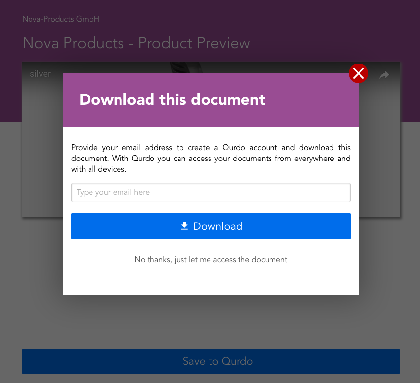 Ihr Besucher wird auf Ihre von Qurdo vollautomatisch generierte Seite geleitet und hat die Möglichkeit Ihr Dokument herunterzuladen. Bevor er dies herunterladen kann, hat er die Möglichkeit seine E-Mail Adresse einzugeben.